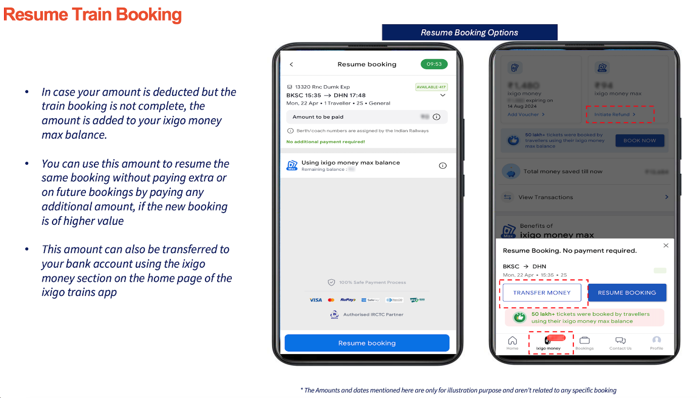 | Advisor will ask the user to resume the booking from the Transactions Section on the ixigo web/app. He just needs to provide the IRCTC password and captcha again. Also, advisor needs to inform the customer that he need not pay anything again. If the refund was already done to IMM and user has transferred this amount back to his account, user will be asked to pay for the booking | L1 Advisor |