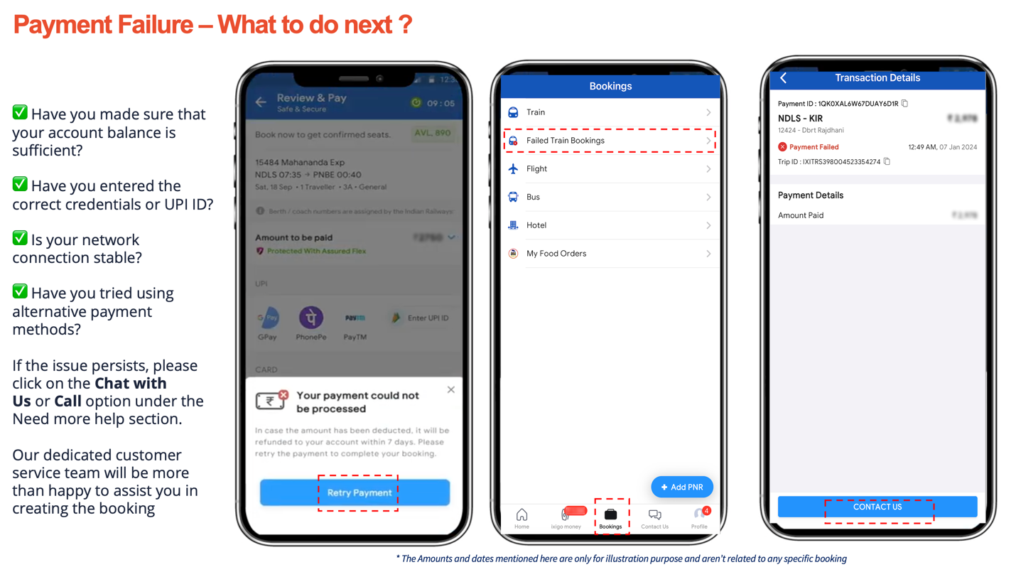 Steps to Resolve Payment Failures - 1. Check Internet Connection: Ensure you have a stable internet connection. 2. Verify Payment Details: Double-check the entered payment information for accuracy. 3. Sufficient Funds: Ensure there are enough funds in your account or that your card has not expired. 4. Retry Payment: If the transaction fails, wait for a few minutes and try again. 5. Contact Support: If the problem persists, contact ixigo’s customer support or your bank for further assistance. 6. Use Alternate Payment Methods: Try using a different payment method, such as another card, UPI, or net banking.